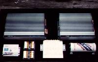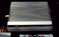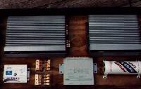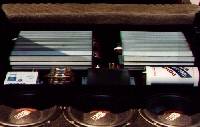 | Amp Rack Installation: Figure 7 Shown here is the HiFonics 'Generation X' Saturn. This unit has an optional input/crossover endcap installed to allow for built in control of highpass/lowpass settings. Rated at 60X4, 2 channels are dedicated to the set of USD D2 waveguides and 2 channels are dedicated to a 5 1/4" and 6 1/2 set of Audio Art midrange and midbass drivers. | ||